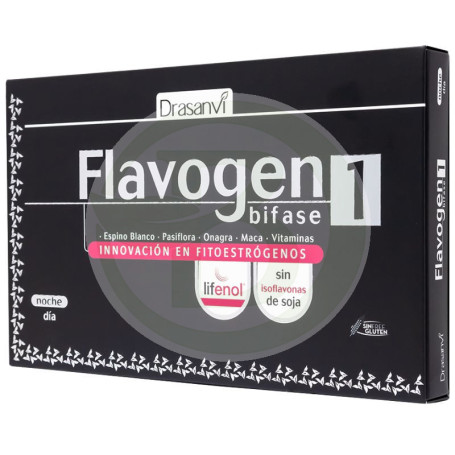 Flavogênio Bifase É um produto hormonal sem soja que fornece fitoestrogênios do lúpulo. Também é enriquecido com ingredientes como: Maca, Hawthorn, Passionflower ou Vitaminas B6.
